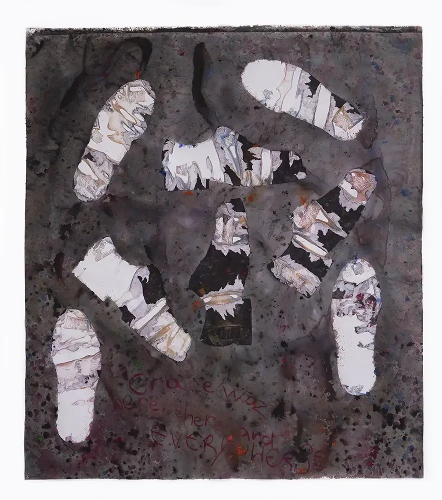 'It was summer. I had just finished loads of work on freedom, liberty, and being yourself. I’m in the studio thinking about what to do and I thought about shoes. I used to have 30 pairs of shoes, now I just have different colours of the same shoes. Dr Martens are all I can wear as I have an AFO on my right leg AND I have to buy two pairs each time, a size 4 and a size 5. So, this started me thinking …….'