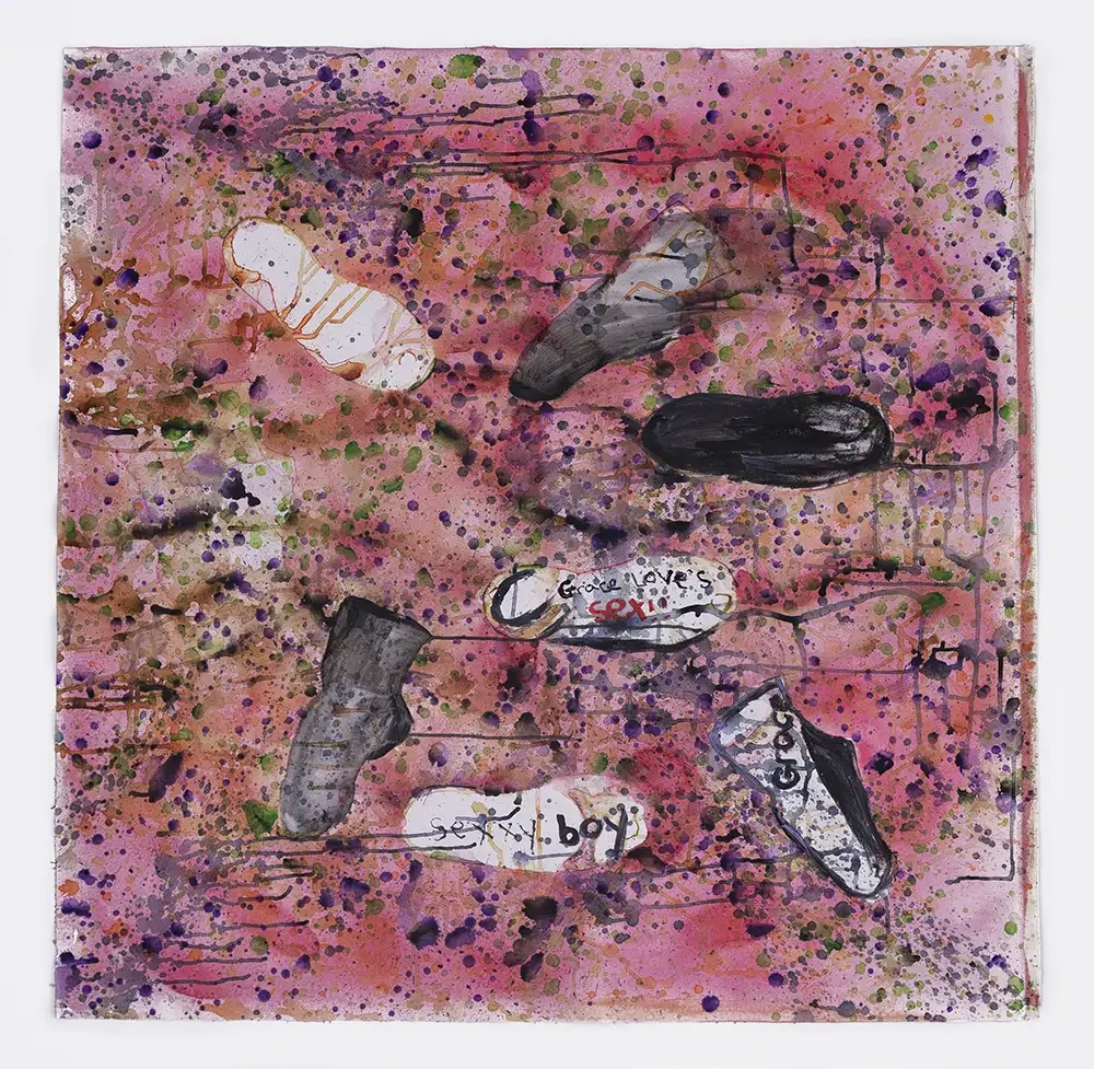 'It was summer. I had just finished loads of work on freedom, liberty, and being yourself. I’m in the studio thinking about what to do and I thought about shoes. I used to have 30 pairs of shoes, now I just have different colours of the same shoes. Dr Martens are all I can wear as I have an AFO on my right leg AND I have to buy two pairs each time, a size 4 and a size 5. So, this started me thinking …….'